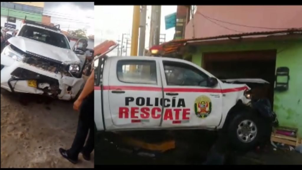 En estas condiciones terminaron un vehículo de la policía de rescate y una camioneta de propiedad de una empresa. El hecho sucedió en la vía Fernando Belaunde Terry Sur en el distrito de la Banda de Shilcayo, frente a un conocido grifo. Las unidades impactaron de tal forma que el vehículo policial por pocos se empotra en un local de venta de frutas. Un usuario de Facebook grabó las imágenes minutos después de lo sucedido indicó que la camioneta policial iba en comisión de emergencia cuando apareció la camioneta e impactaron.