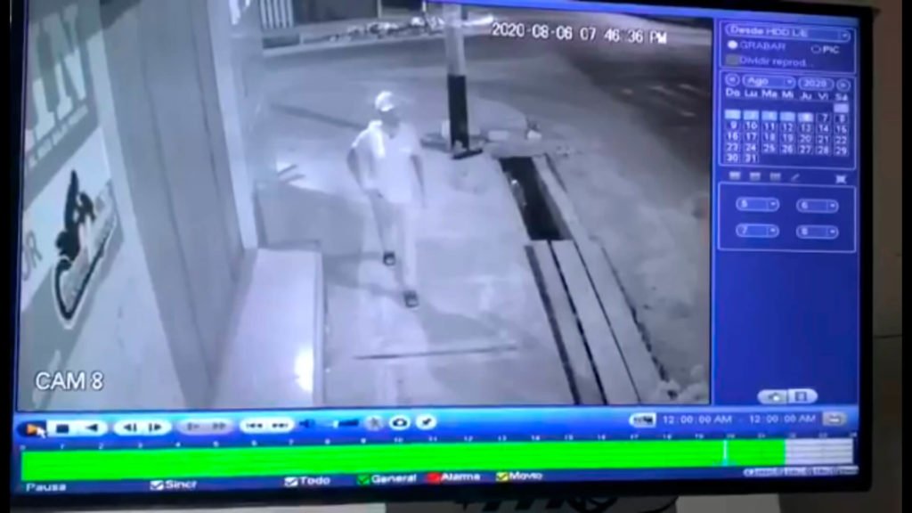 Las cámaras de videovigilancia de la cuadra 04 del Jr. Santa María en la Banda de Shilcayo captaron cuando el presunto sicario llega al domicilio de empresario Jorge D’ambrosio Rengifo y le dispara a quemarropa desde la puerta de su domicilio y también a través de su ventana.