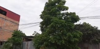 Tarapoto: Poste de telefonía colapsó, árbol lo sostiene