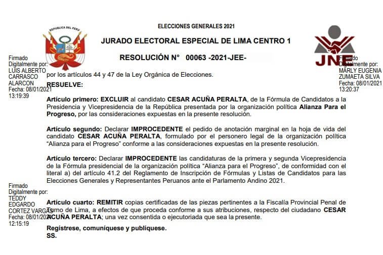 El Jurado Electoral Especial de Lima Centro 1 resolvió excluir al candidato César Acuña Peralta de la fórmula de candidatos a la Presidencia y Vicepresidencia de la República presentada por la organización política Alianza para el Progreso debido a faltas en su Hoja de Vida.