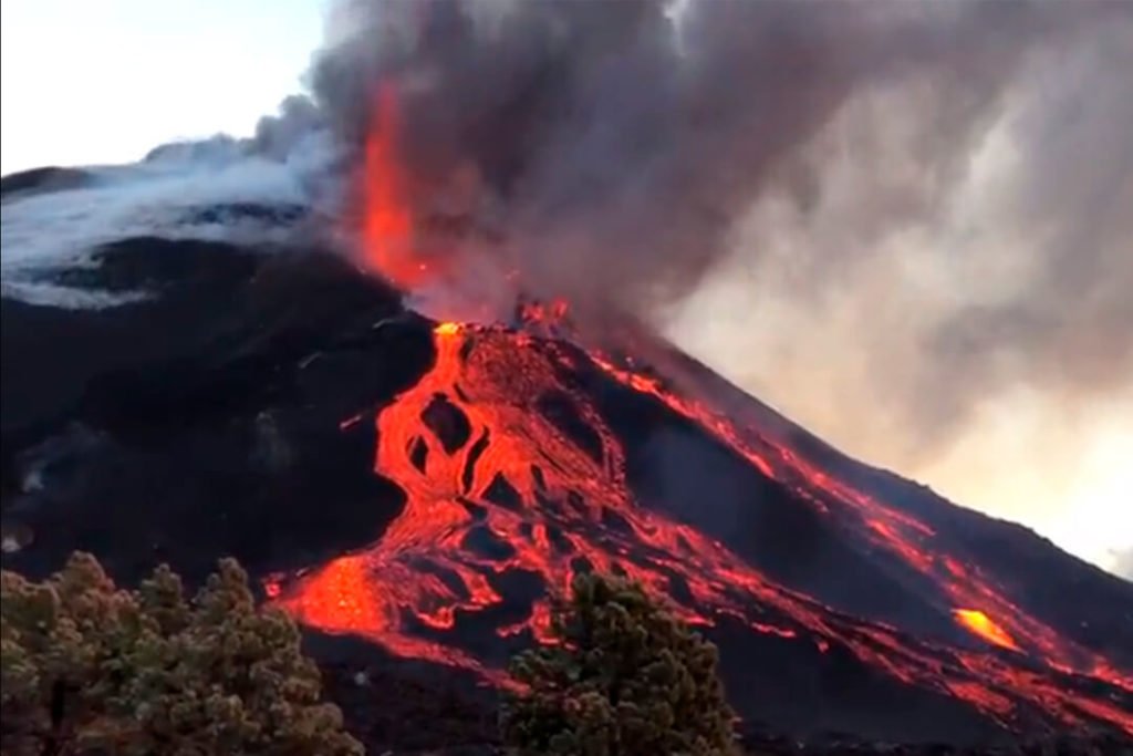 El cono volcánico surgido de la erupción que comenzó el pasado 19 de septiembre en Cumbre Vieja se reconfigura continuamente debido al peso del material magmático. Ayer mismo el cono interno del volcán colapsó sobre sí mismo después de haber sufrido una nueva ruptura horas antes, provocando una gran emisión de lava.