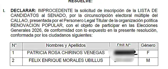 El Jurado Electoral Especial (JEE) del Callao declaró improcedente la lista de candidatos al Senado presentada por Renovación Popular para la circunscripción electoral del Callao, decisión que excluye de la contienda electoral 2026 a Patricia Chirinos Venegas y Félix Enrique Morales Ubillus.
