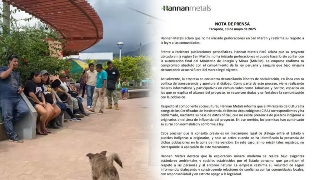 En una declaración pública, el presidente del Frente de Defensa de los Intereses del distrito de Tabalosos, Juan Cortegana, anunció que la población no permitirá el avance del proyecto minero de la empresa Hannan Metal en su jurisdicción, advirtiendo sobre posibles impactos ambientales irreversibles.