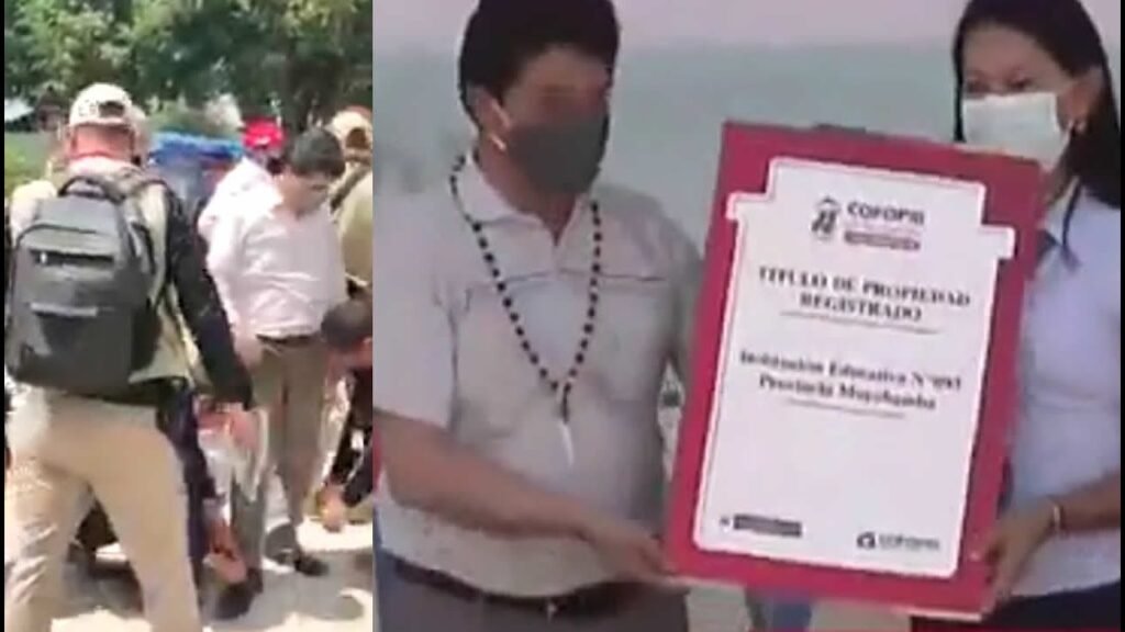 El presidente de la república, Pedro Castillo Terrones, llegó a la región San Marín para entregar 1,200 títulos de propiedad y equipamiento urbano en el centro poblado La Libertad, distrito de San Rafael en Bellavista. Imágenes de su personal de seguridad amarrándole los pasadores de sus zapatos causó severas críticas.