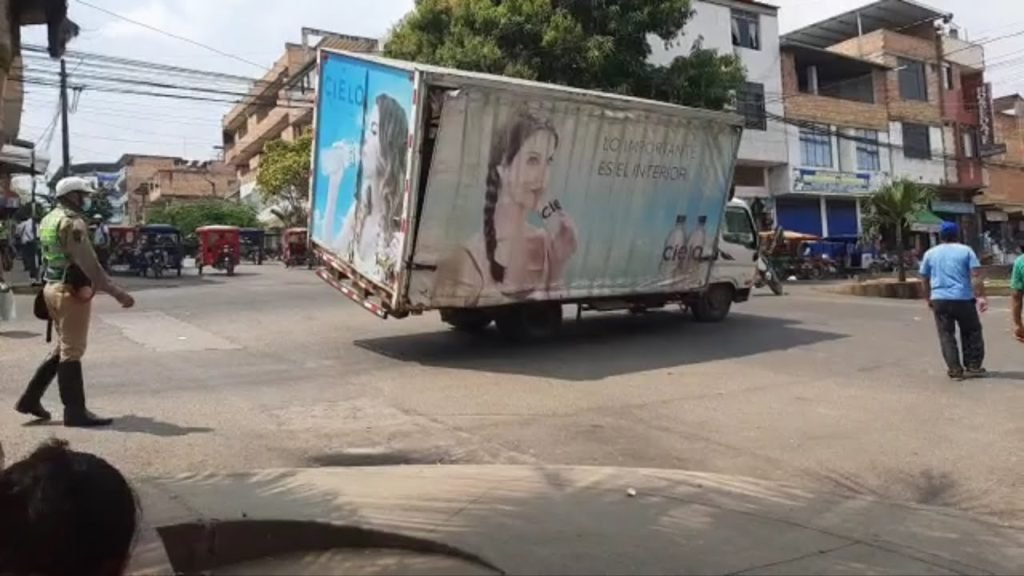 En estas condiciones terminó un camión repartidor de bebidas gasificadas en la interacción de los jirones Comandante Chirinos y Tahuantinsuyo en el barrio Comercio en Tarapoto, luego que el aparente exceso de peso y la calle pendiente hizo que los productos se movieran a un costado quedando inclinada en plena esquina.
