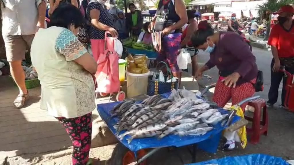 Expenden pescado fresco, seco, frutas, verduras y otros productos. Dijeron que tienen que enfrentar dos virus, uno la pandemia y otro el desalojo por parte de los municipales que los sacan de la vía pública.