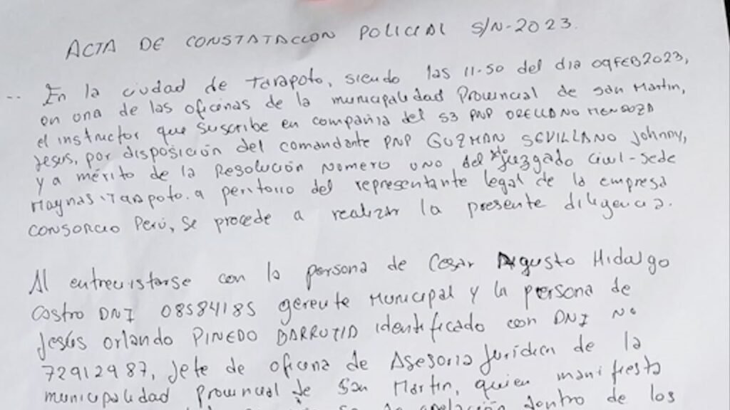 Acompañado de dos efectivos policiales, la tarde del jueves 09 de febrero, Ángela Verónica Requejo Cardozo, representante común del Consorcio Perú, junto a Octavio del Águila, asesor legal de la misma, llegaron hasta la Municipalidad provincial de San Martín para realizar una constatación policial.