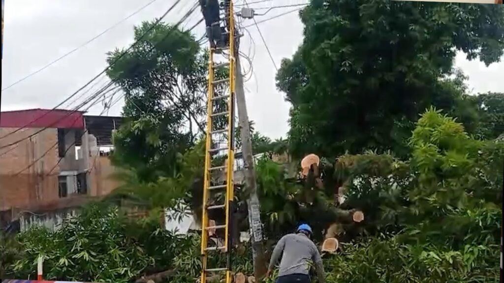 Un gigantesco árbol de mango fue derribado por los fuertes vientos acompañados de lluvias registrados la tarde del sábado en la cuadra 12 del Jr. Jiménez Pimentel, en la ciudad de Tarapoto. El árbol cayó directamente sobre los cables de energía eléctrica, generando gran preocupación entre los vecinos por el riesgo inminente de una descarga eléctrica.